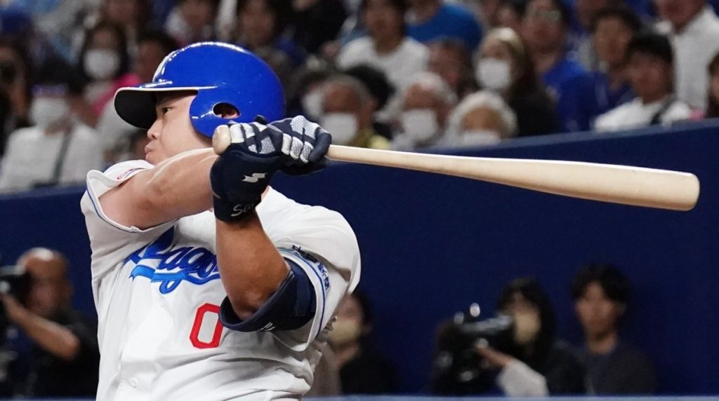 この回先頭の6番福永裕基が外角難しい球をライト線へヒットで出塁。7番龍空が送りバント。8番石橋康太が打席へ…