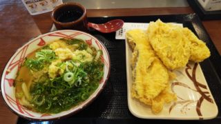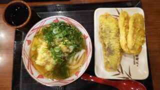 丸亀製麺になす🍆の天ぷらが出た✨揚げたては熱いので要注意‼️隣のれんこん天と比べてもかなりの大きさです🎵どっちも1個140円。