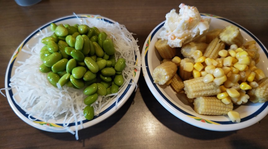 今日は白の大根に緑の枝豆をのせて、「メジロサラダ🥗」(笑)