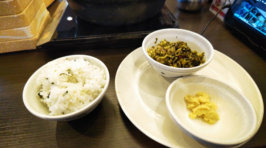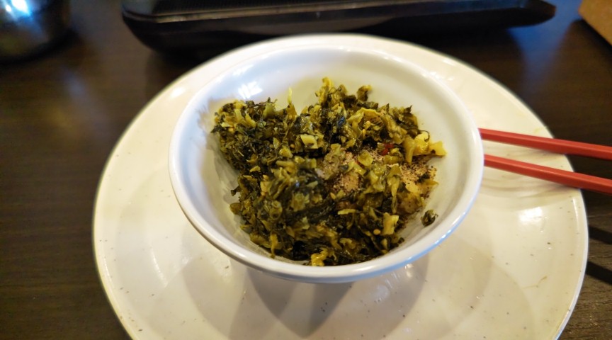 そしてショウガと高菜のタレに付けて食べていきます🎵おかわり用のショウガも準備OK🥺