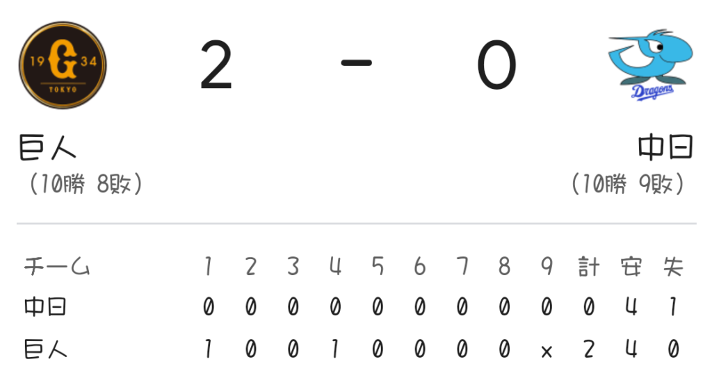 先発小笠原慎之介の7回2失点(自責点1)の好投も打線の天気同様バットも湿り、沈黙で2試合連続完封負けでついに5連敗。貯金は1になった。