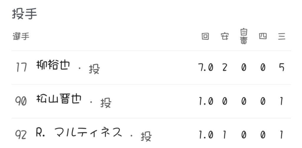 8回は松山晋也、9回はセーブシチュエーションではないが月間MVPのライデル・マルティネスが登板。