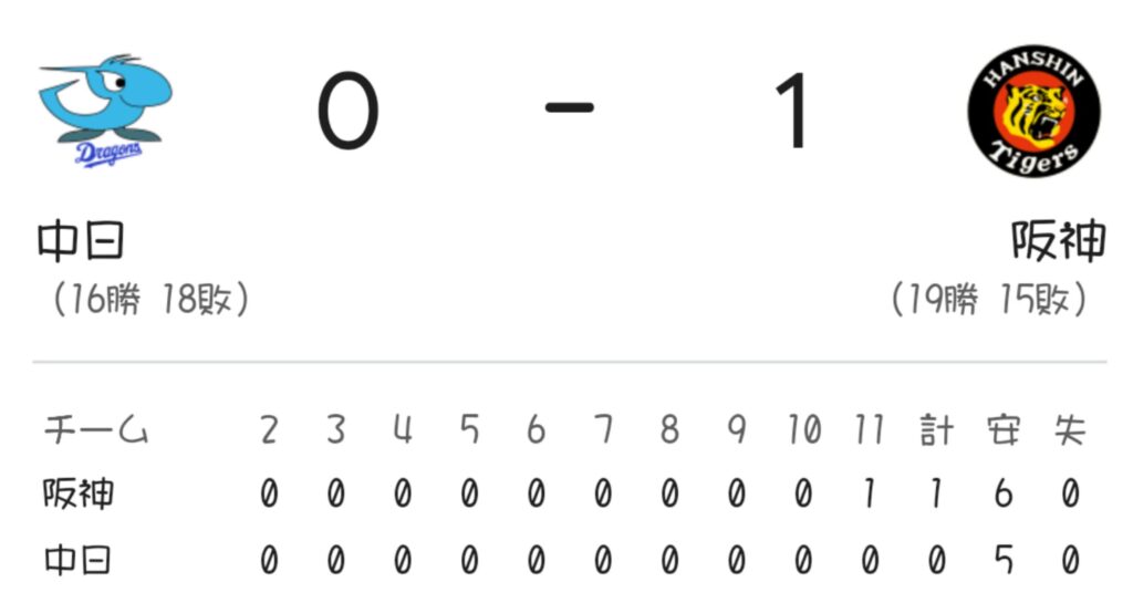 中日0-1阪神(バンテリン)