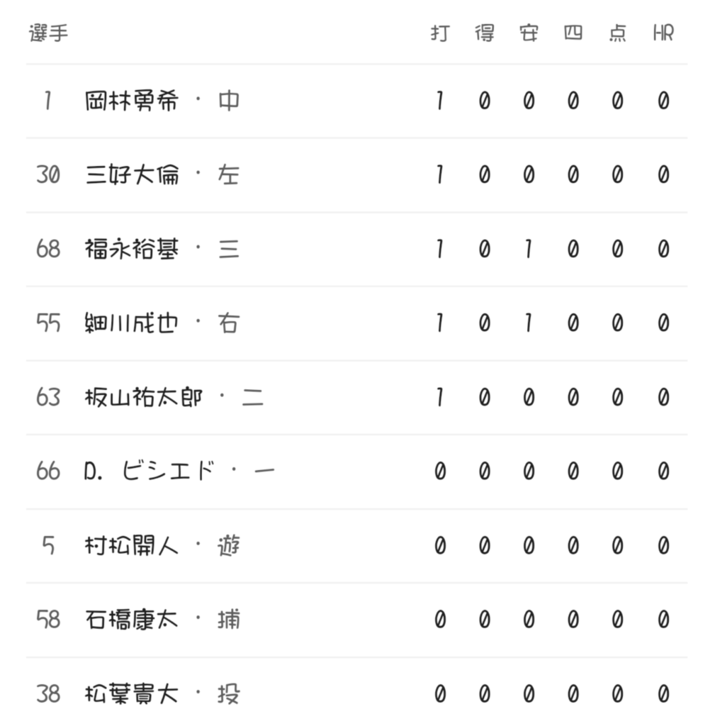 5回オモテに先頭7番村松開人がヒットで出塁、8番やっと上がってきた石橋康太が初ヒットで無死1,2塁とチャンスを広げる。