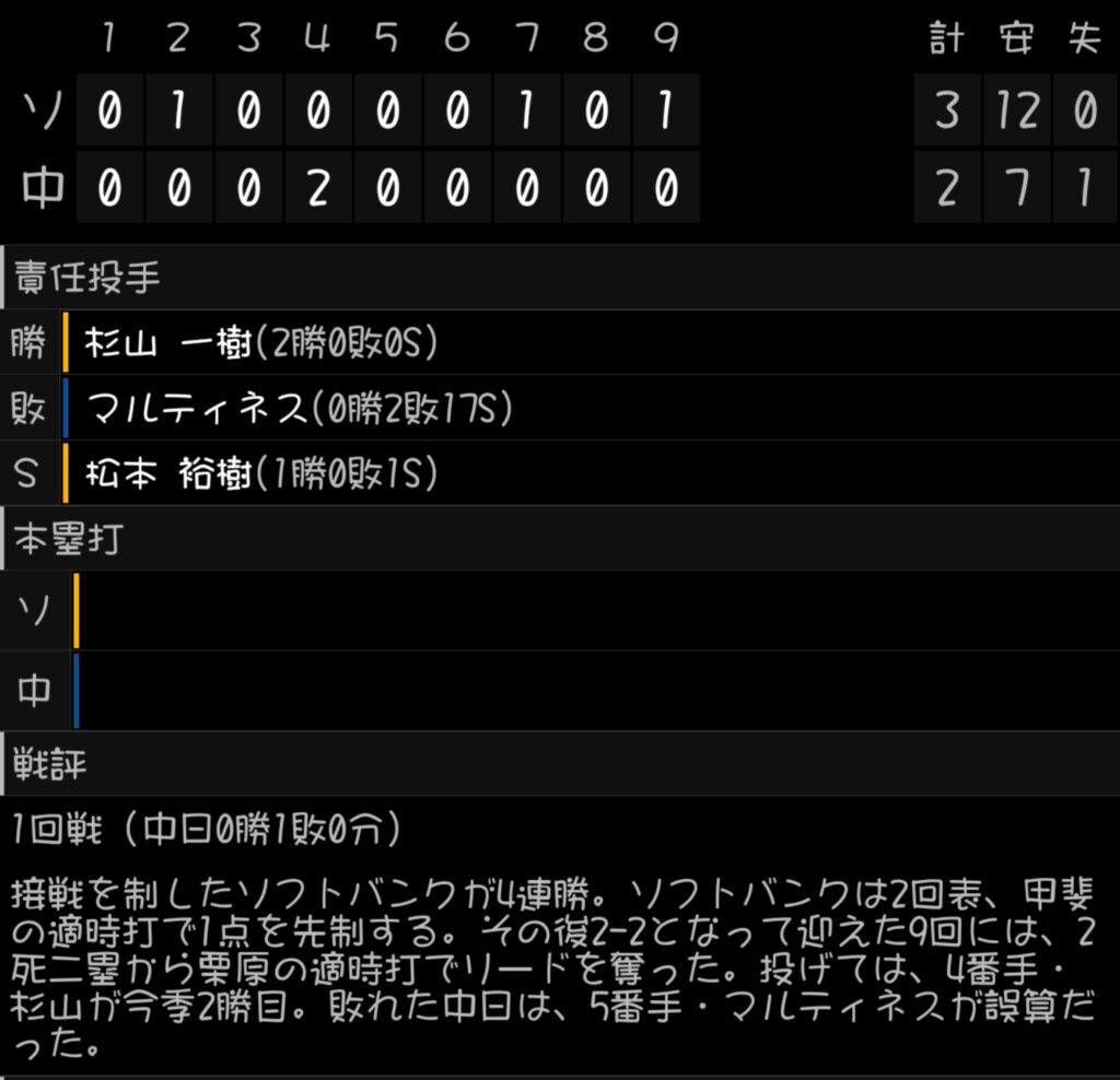 中日2-3ソフトバンク(バンテリン)