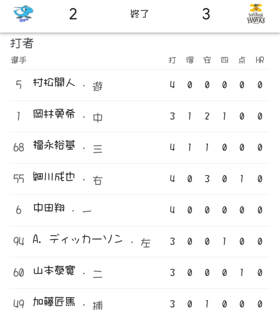一時は逆転するも、同点にされ、ライデル・マルティネスが打たれて惜敗。チャンスに打てるか否かがはっきりした厳しい試合でした。😓