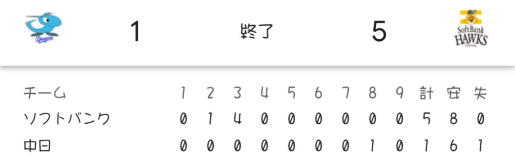ライン際の打球がホークス打線は入り、ドラゴンズ打線は切れるところも狙い球の絞り方によるところも大きいように思える。