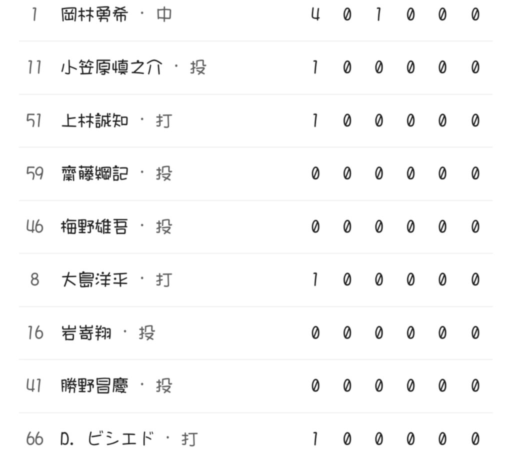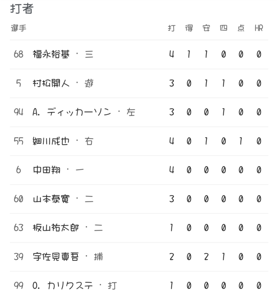 板山祐太郎も2軍から上がってきてなんとか頑張ってほしい選手である。セカンドに終盤出場しているのでなんとか1打席みたいものだ。