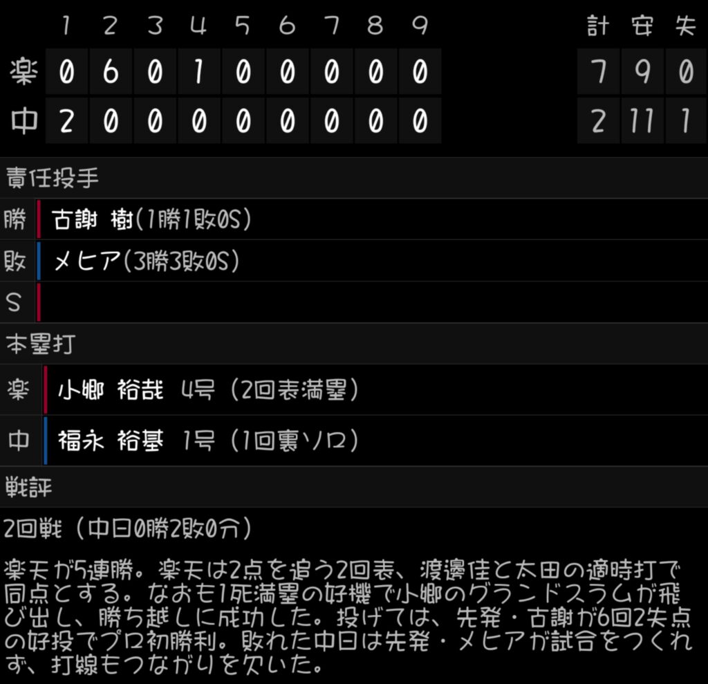 打線は初回に福永が今季1号ソロを放ち、チーム2試合ぶりの先制点をもたらした。さらにカリステも適時打を放ったが、この2得点のみ。楽天のドラフト1位左腕・古謝にプロ初勝利を献上した。
