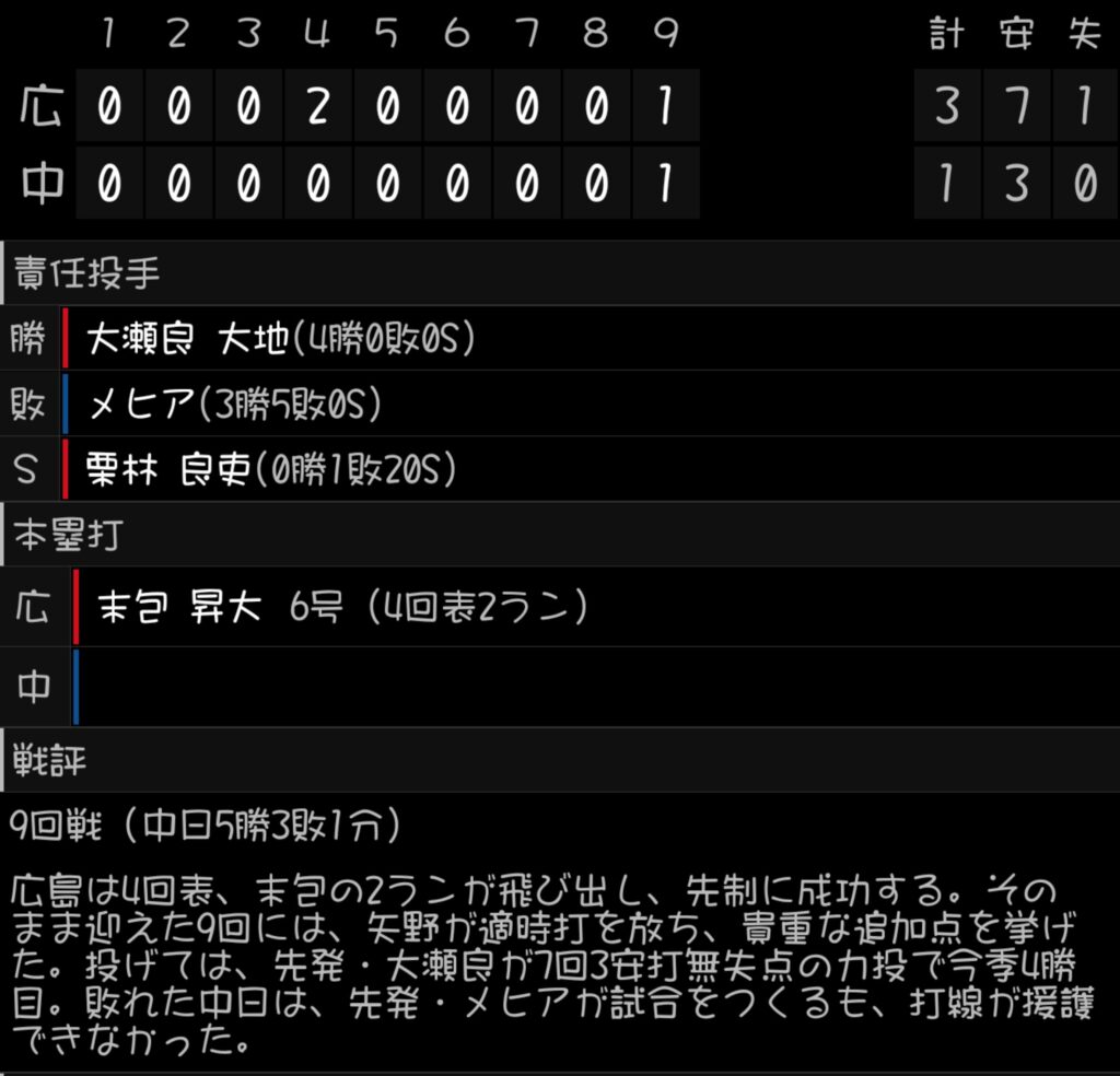 中日ドラゴンズ1-3広島東洋カープに
