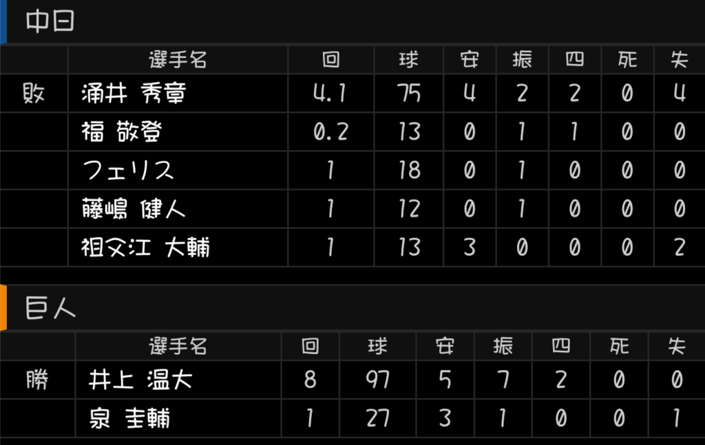 巨人先発井上の球を序盤戦なかなか捕らえきれずに相手のペースで投げさせてしまった。