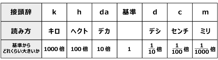 接頭辞は「10の累乗倍の数」を示すものとして規定されています。つまり、基準の単位からどれくらい大きいか(or小さいか)を表すものといえるでしょう。代表的な接頭辞を表にすると次のようになります。