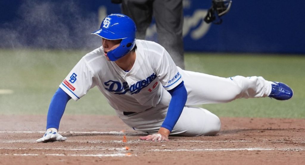 との試合後の立浪監督の談にもあったが代打松山のサード後方ホームと逆向きで取ったファールフライで3塁ランナーが思い切ってタッチアップするが隙を見せない福永の送球でヒヤヒヤ逃げ切り、カード勝ち越しを決めた✨