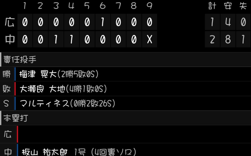 福永選手の先制タイムリーに板山選手の移籍後初ホームラン⚾️!!梅津投手もナイスピでした✨✨
