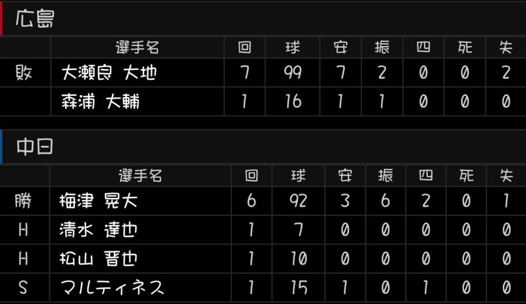 先発はドラゴンズ梅津晃大、広島は難攻不落の大瀬良大地の厳しい試合。