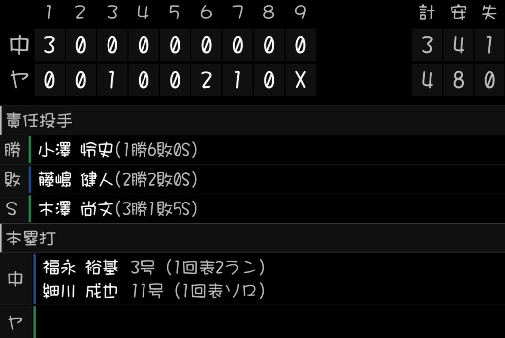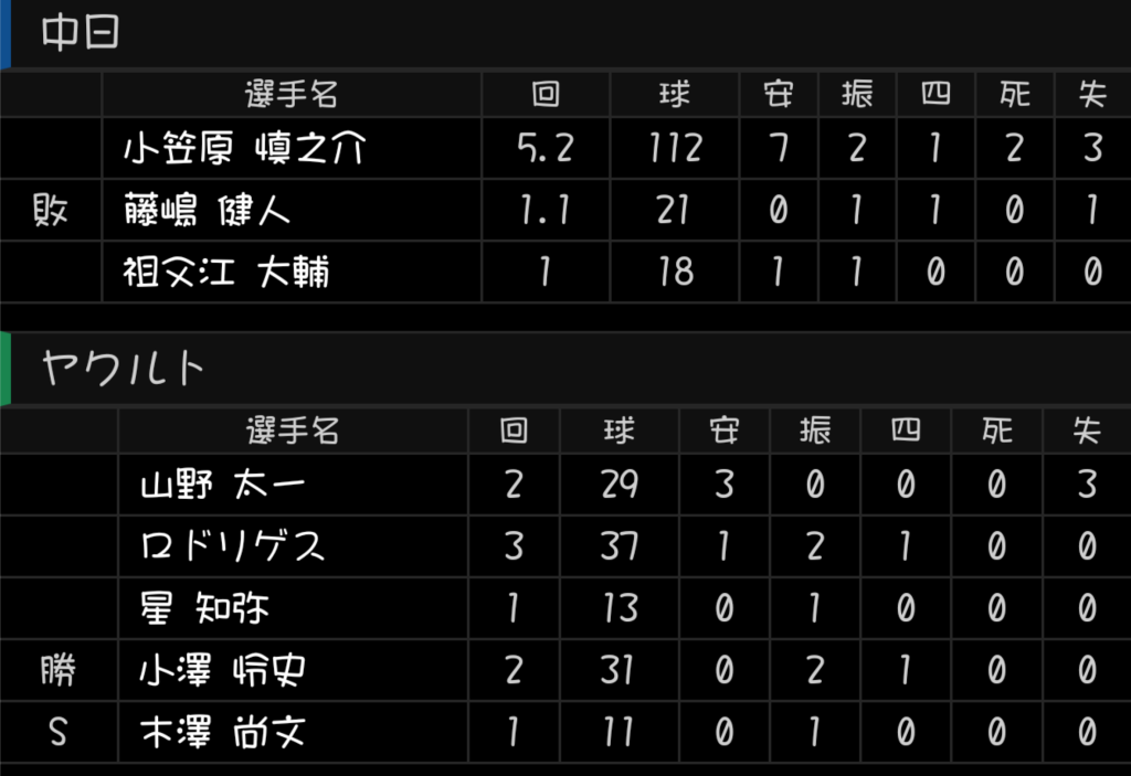 7回にはロドリゲスのエラーという形で勝ち越しを許すが藤嶋健人もノーアウトの走者を四球で簡単に出して村上宗隆にヒットコースに打たれてそれをショートのロドリゲスが捕球できなかったのでロドリゲスだけを責めるのは酷だと思う。