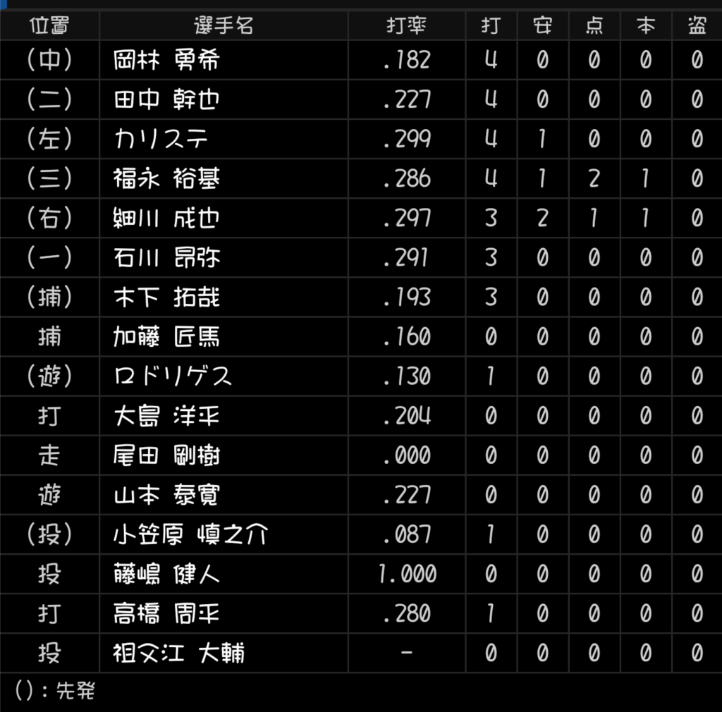 しかし、ロドリゲスは打撃が悪すぎる。加藤匠馬と並ぶと789番が投手のようで1イニングが丸々無駄になってしまう。ショートは村松開人の離脱によるロドリゲスの起用は仕方がないが、捕手は石橋康太をメインで使うべきだと思う。
