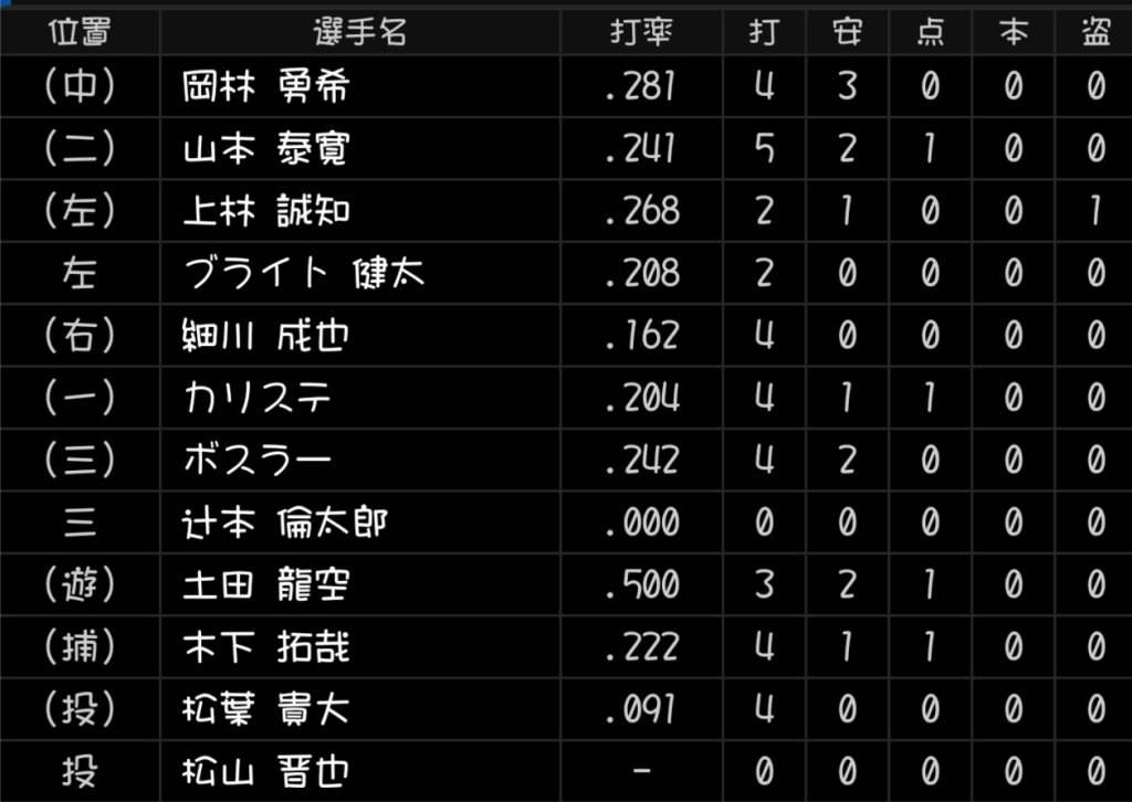 そんななかでは土田龍空が元気だし、カリステも相変わらず野性的で魅力いっぱいでいい。2人とも打点をあげて頼もしい存在である。