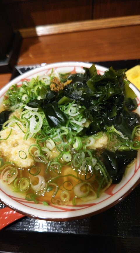 ショウガ摂取にネギ、ワカメ、食べるラー油でかけうどんがかなり具だくさんになりました(笑)