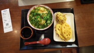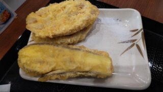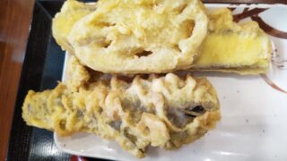 丸亀製麺に細長い細竹天が登場。れんこん天と比べてもこの長さ‼️たけのこらしくしゃきっとしててほんのり甘くてヤバいじゃん、うまい🎵